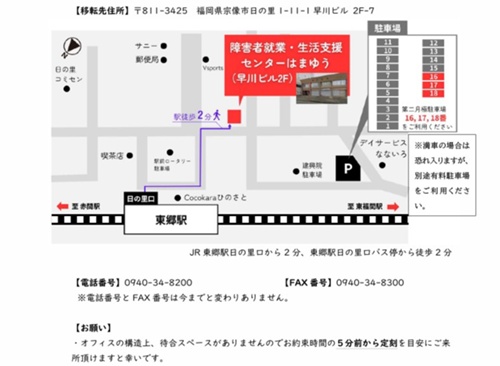 障害者就業・生活支援センターはまゆうは、令和8年4月1日にお引越ししました。新しい事務所は、東郷駅から歩いて3分と今までよりもアクセスしやすくなりました。今後も気軽に相談できる場として皆さまの心の支えになれるよう、取り組...